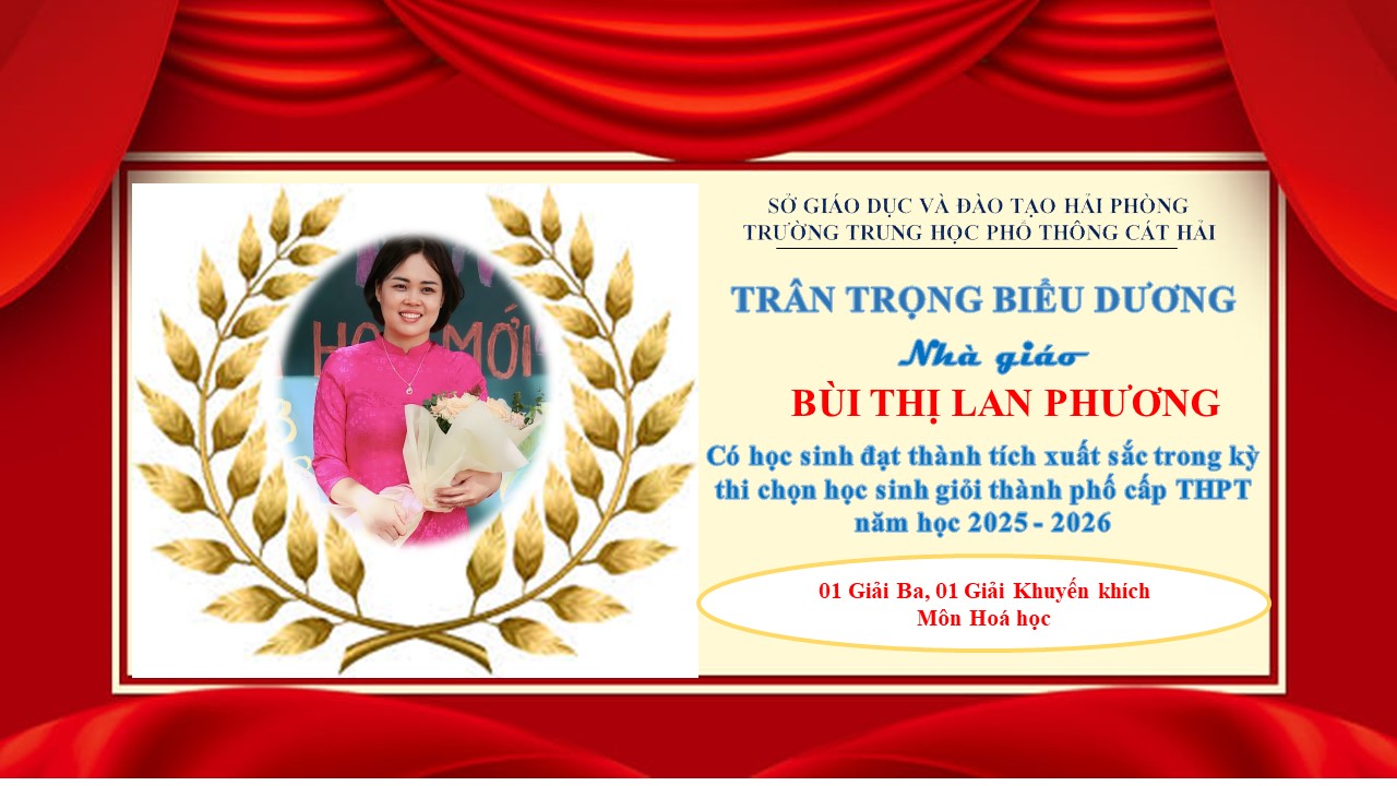 Trường THPT Cát Hải trân trọng vinh danh và chúc mừng các em học sinh đã nỗ lực, bản lĩnh và xuất sắc đạt thành tích cao trong Kỳ thi học sinh giỏi cấp thành phố năm học 2025 – 2026; Đồng thời biểu dương những đóng góp đầy tâm huyết của cô giáo Bùi Thị Lan Phương - Giáo viên môn Hóa học đã có học sinh đạt thành tích đáng tự hào. Trong kỳ thi năm nay, kết quả nổi bật: