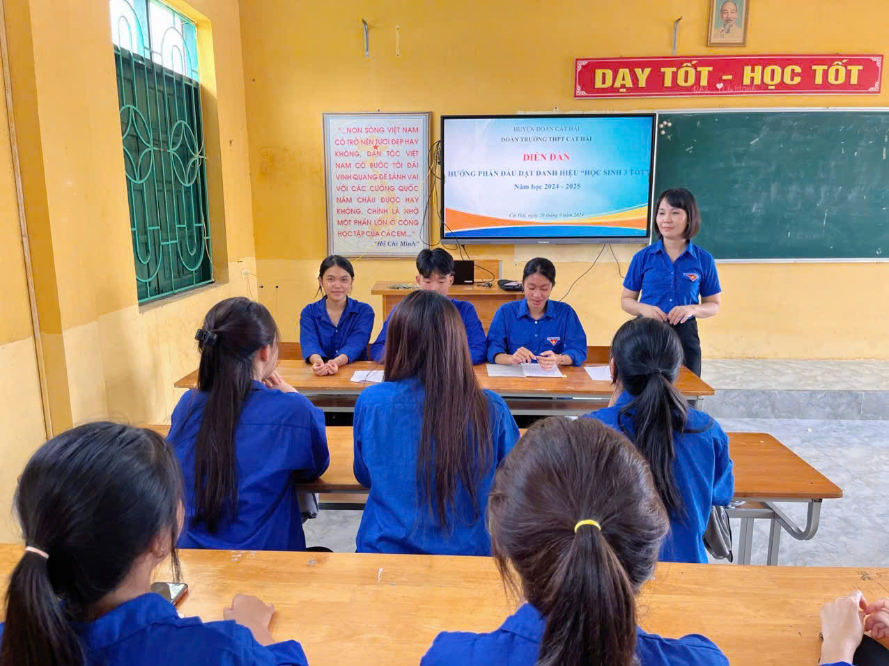 Nhằm góp phần thực hiện hiệu quả phong trào thi đua “Học sinh 3 tốt” do Trung ương Đoàn phát động, vừa qua, Đoàn trường THPT Cát Hải đã tổ chức Diễn đàn tuyên truyền, phổ biến và triển khai phong trào “Học sinh 3 tốt” với sự tham gia sôi nổi của đông đảo đại diện đoàn viên, học sinh trong toàn trường.