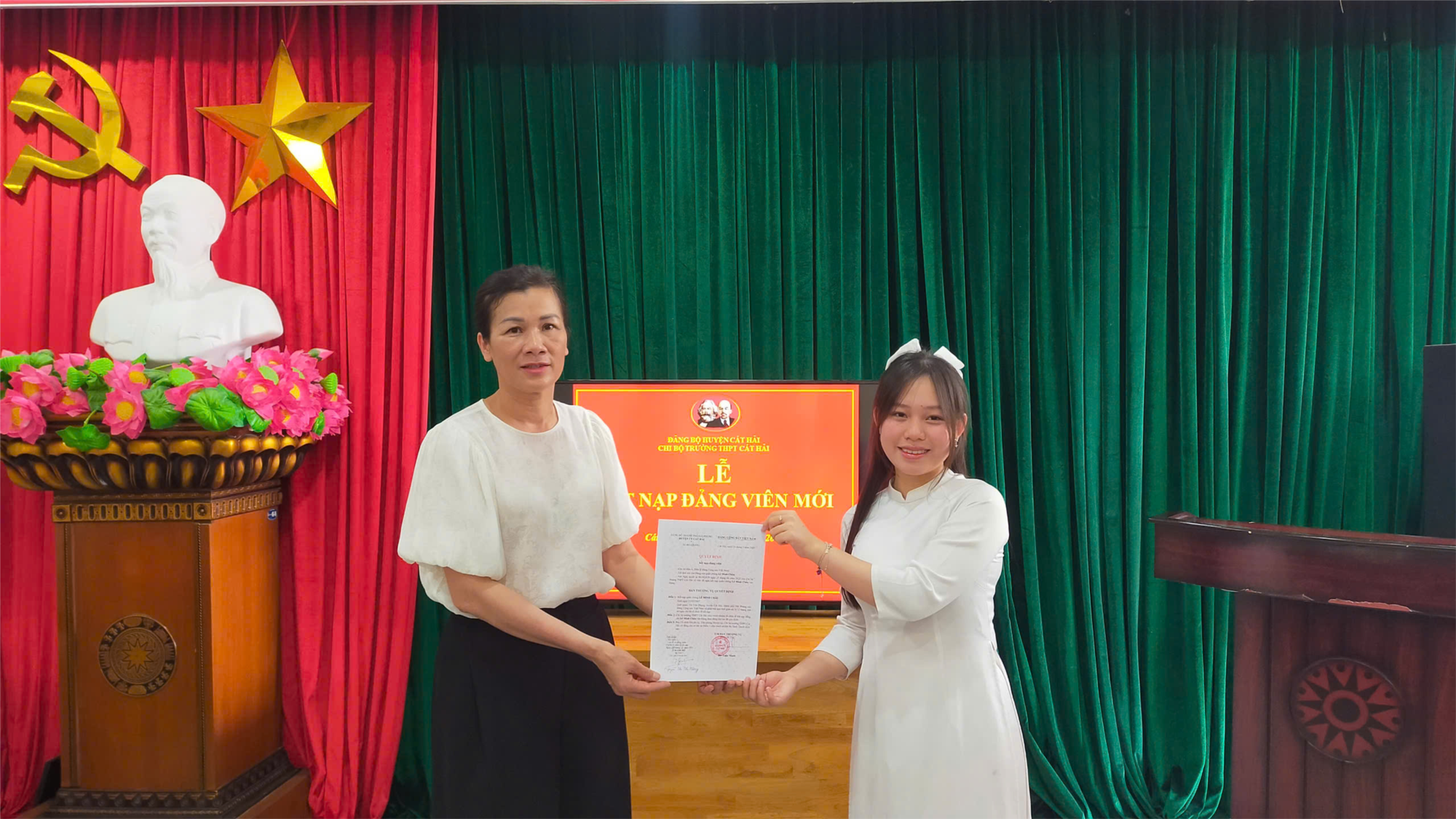 Sáng ngày 9/6/2025 Chi bộ trường THPT Cát Hải long trọng tổ chức Lễ kết nạp Đảng viên mới cho học sinh – đợt thứ hai trong năm học 2024 - 2025. Đây là sự kiện có ý nghĩa chính trị đặc biệt, thể hiện sự quan tâm của Chi bộ nhà trường trong công tác phát hiện, bồi dưỡng, rèn luyện học sinh ưu tú đứng vào hàng ngũ của Đảng Cộng sản Việt Nam.